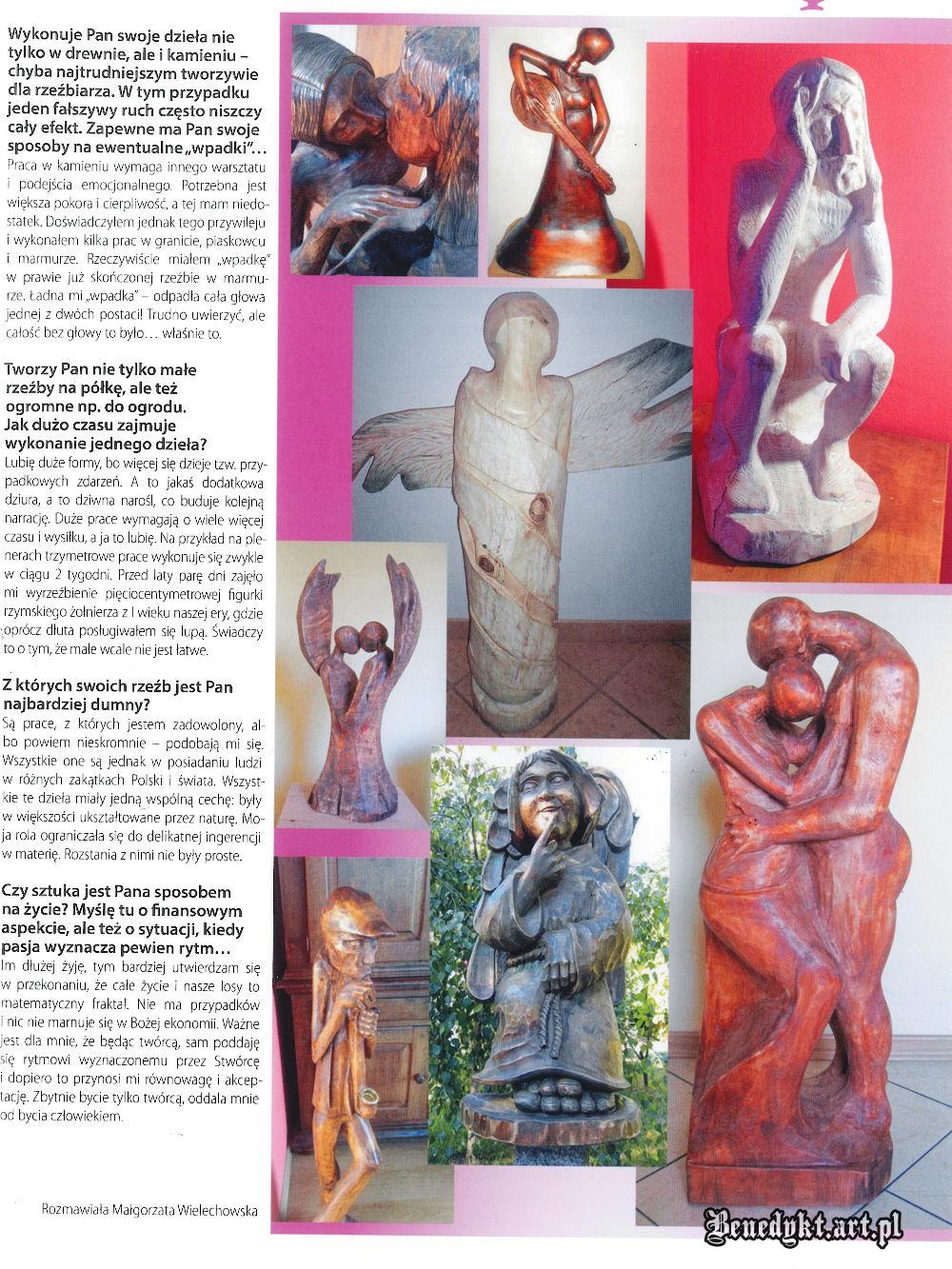 Tę dostępność w internecie zawdzięczam starszemu synowi Filipowi, a młodszy Paweł jest wrażliwym krytykiem moich prac. W 2005 r. podczas indywidualnej wystawy w Muzeum Regionalnym w Kozienicach obchodziłem 20-lecie pracy twórczej. Tak więc dziś jest to blisko 30 lat twórczości. Przyjaźń z rzeźbą to szczególny stosunek do drewna jako tworzywa czy też drzewa, które często samo w sobie nosi znamiona dzieła sztuki.